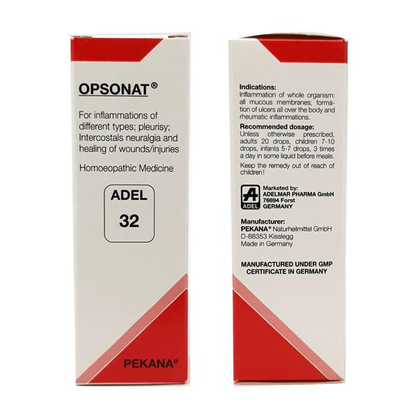 ADEL 32 (OPSONAT) drops promote healing of focal infections in various organs and stimulate, regulate and clean the blood. This medication also enhances the immune system’s ability to eliminate pathogens, including those found in therapy-resistant mycotic infections. Once the terrain is cleared of toxic wastes, ADEL 32 drops stimulate the body’s own systemic regulation, making true healing possible.