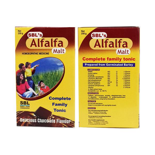 SBL Alfalfa Malt is a well balanced combination of homoeopathic medicines. Malt is made from germinated barley which is a rich source of proteins, minerals, vitamins and other nutrients. SBL Alfalfa Malt provides all essential nutrients to growing children and old debilitated persons. It also increases iron content and thus helps anaemic patients. SBL Alfalfa Malt contains mother tinctures of Alfalfa, Avena sativa and Ginseng. Alfalfa and Avena sativa provide essential minerals and vitamins whereas Ginseng builds resistance to fight against infections, works as revitalizing agent and removes mental and physical debility. The delicious chocolate flavour of SBL Alfalfa Malt makes it palatable.